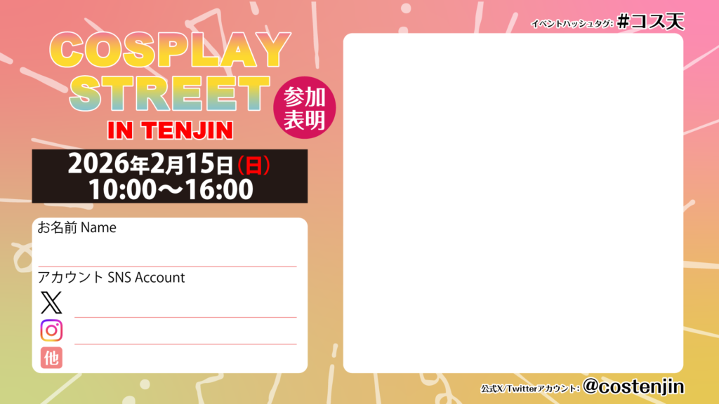 | 雨天の場合 | 雨天決行(台風や深刻な天変地異・その他不可抗力の場合は中止) COSPLAY STREET in TENJIN公式X(Twitter)において当日までに撮影場所などを含めお知らせいたします。 |