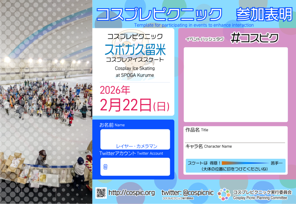 参加表明テンプレートはこちらです。SNSなどで予定キャラを投稿して交流の輪を広げましょう!ハッシュタグは #コスピク です!