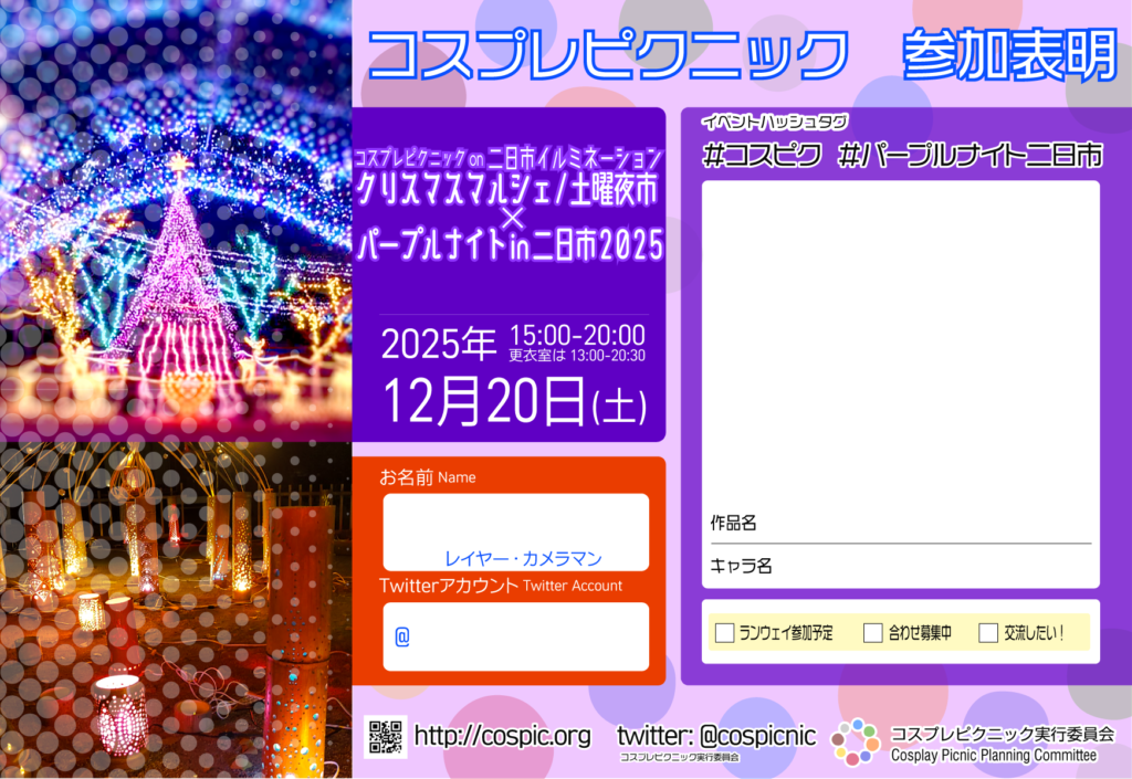 参加表明テンプレートはこちらです。SNSなどで予定キャラを投稿して交流の輪を広げましょう!ハッシュタグは#コスピク #パープルナイト二日市 です!