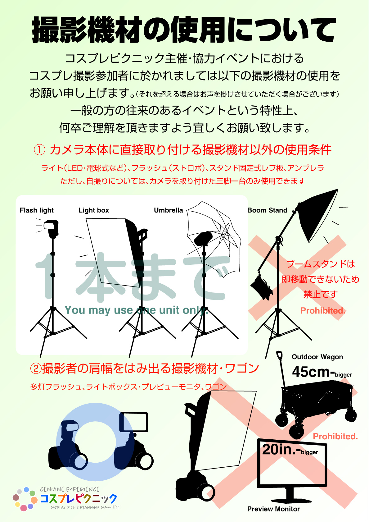 上記の方は、コスプレ参加およびコスプレイヤーの撮影は一切行えません。発見次第撮影した写真を端末・クラウド含め削除し、ご退出いただきます。